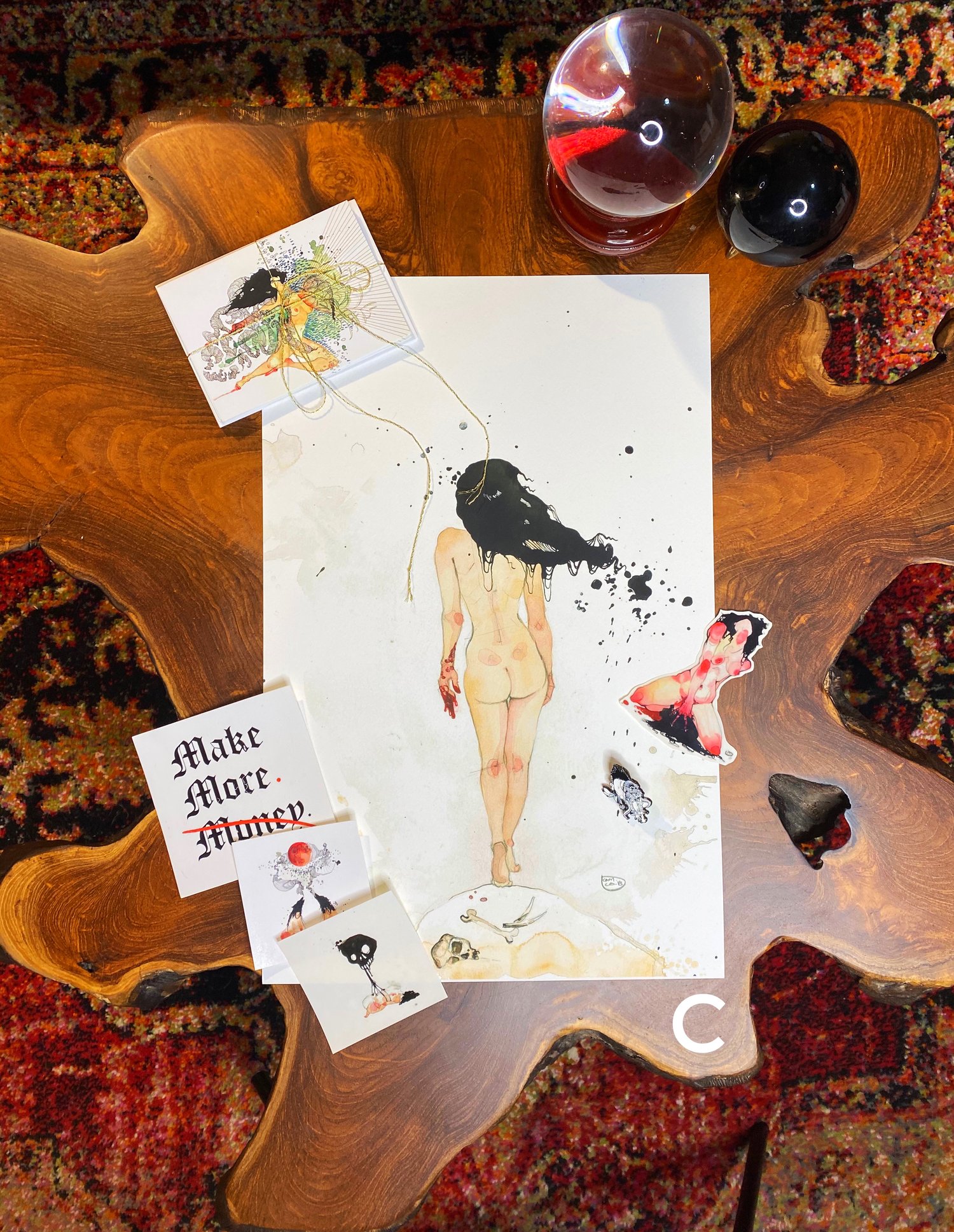Print of your choice, set of 5 note cards, enamel shewolf pin, make more sticker, breathe sticker, Judith and Holofernes sticker and blood moon sticker.